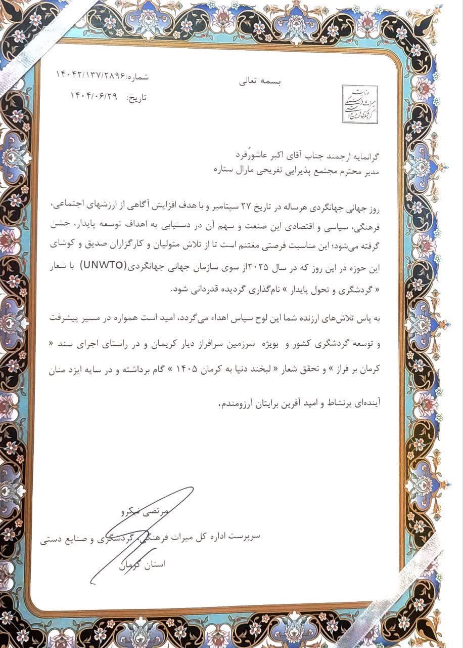 تقدیر از مجتمع مارال ستاره بیاض در هفته گردشگری