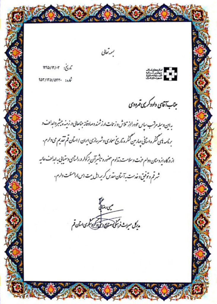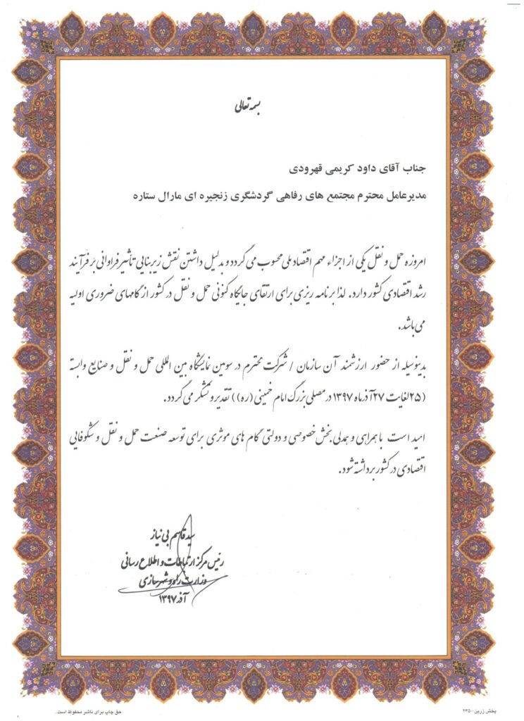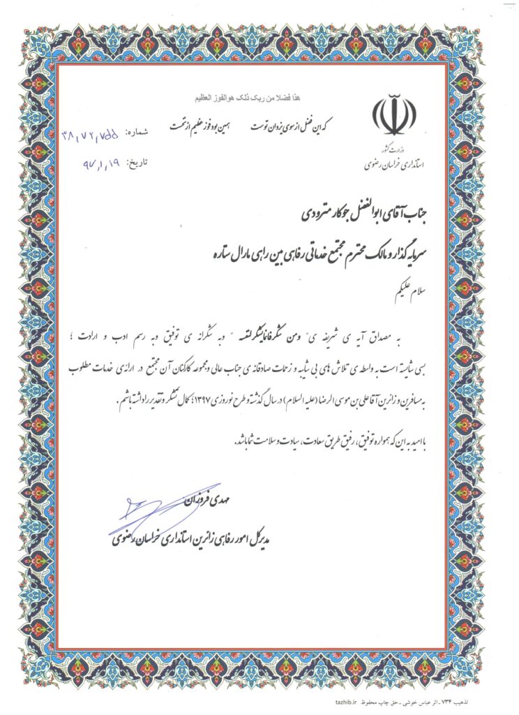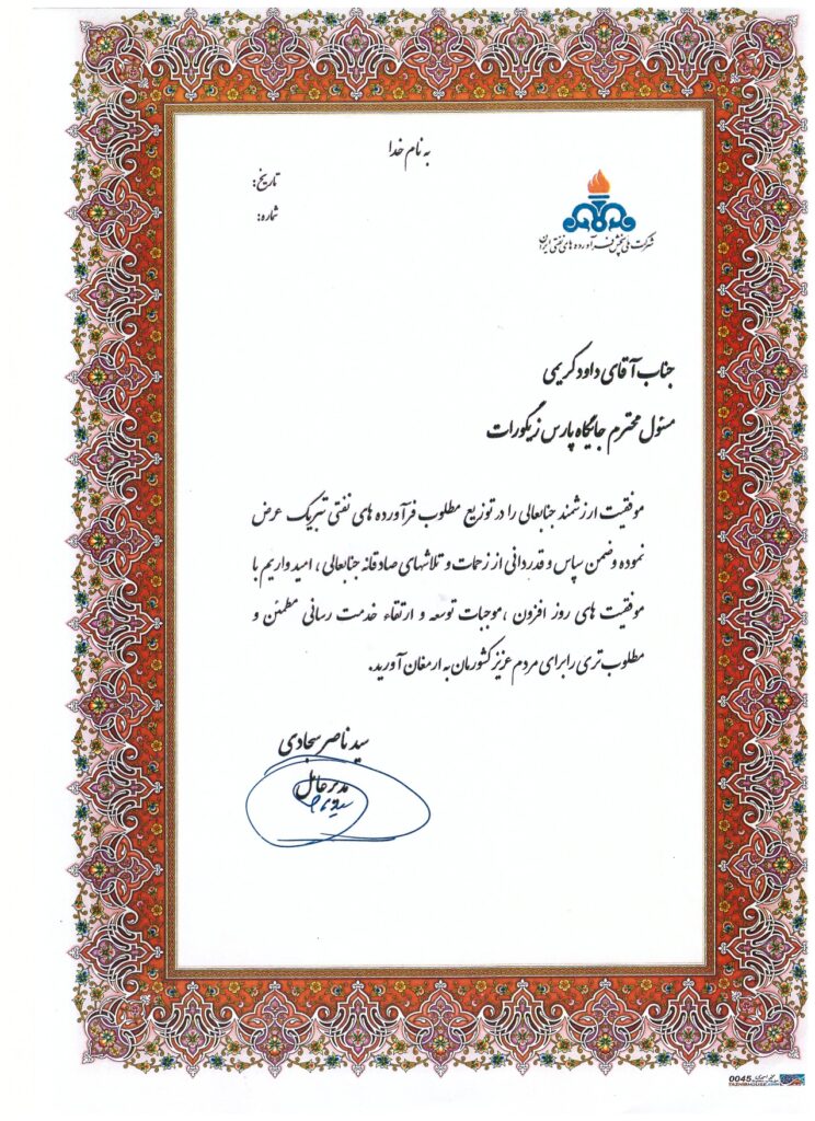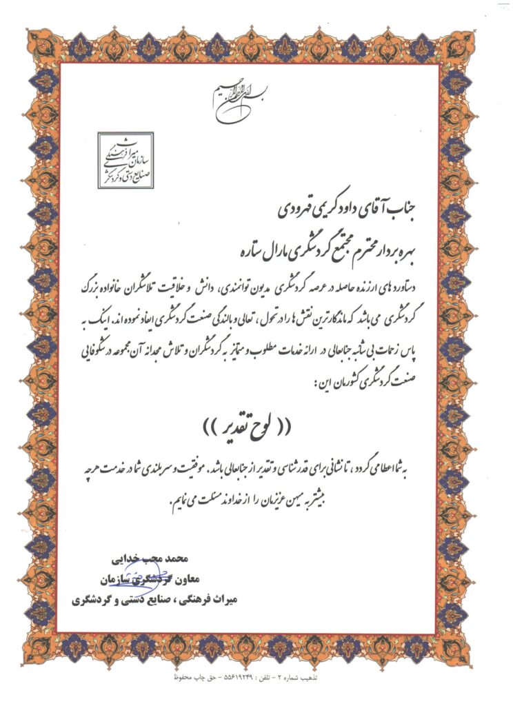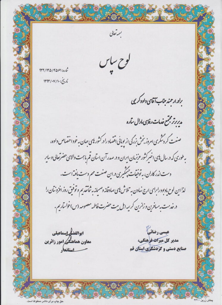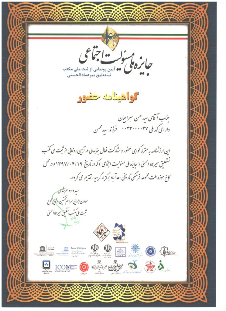 ♦ دریافت گواهی جایزه ملی مسئولیت اجتماعی از سوی سازمان میراث فرهنگی، گردشگری و صنایع دستی.