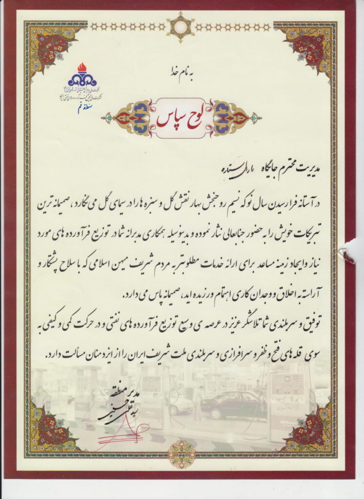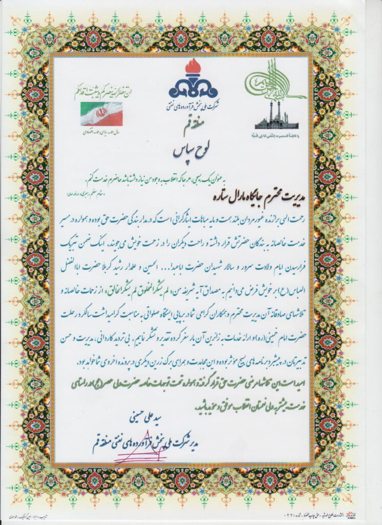 ♦ انتخاب برند مارال ستاره به عنوان یکی از شرکتهای صاحب نشان در حوزه زنجیره توزیع فرآوردههای نفتی از سوی شرکت ملی پخش فرآوردههای نفتی.