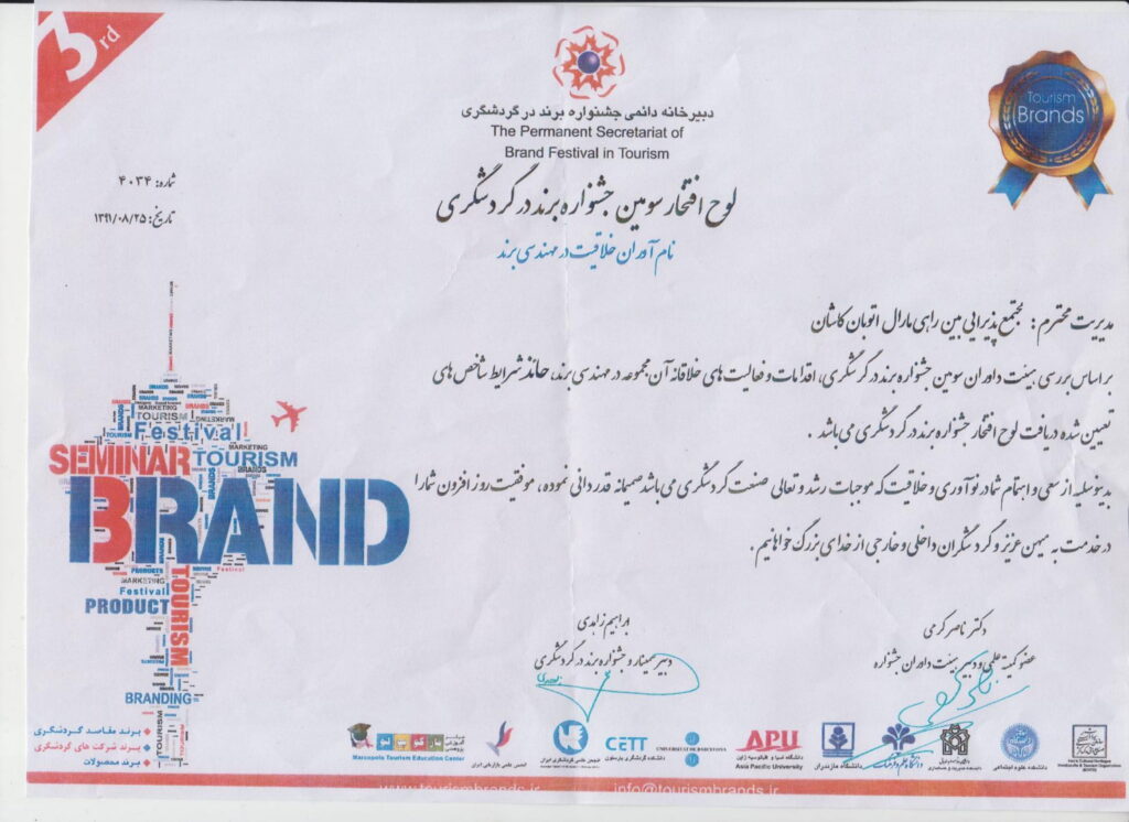 ♦ لوح افتخار جشنواره برند در صنعت گردشگری.